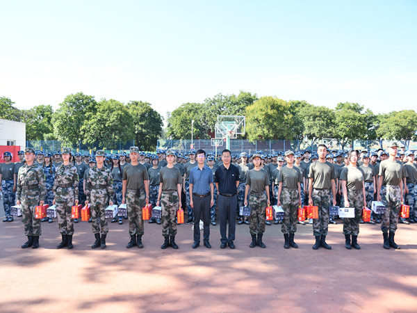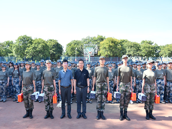 张军驰希望同学们把军训当成一生一次的人生旅程,将泪水和汗水抛在脑后,将勇敢和坚韧贯彻始终,以优异的成绩接受检阅,绽放青春经管之风采。最后,院领导向参训同学发放了精心准备的降温解暑慰问品,并合影留念。