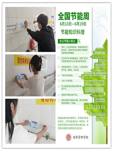 6月13日下午,学院组织团学骨干走进宿舍区、教学楼,通过张贴节能提示贴,号召大家从点滴做起,节约一滴水,节约一度电,大力弘扬勤俭节约的良好习惯;6月14日—19日中午,开展“节能标语在身边”活动,通过分发宣传单,悬挂横幅等方式,广泛宣传,向同学们普及节能减排相关知识,讲解垃圾分类相关方法,倡导绿色消费、低碳生活,传播节能理念。