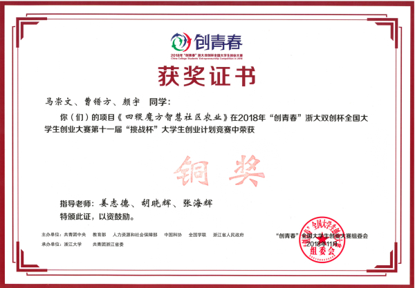 11月4日,由共青团中央、教育部、人力资源和社会保障部、中国科协、全国学联、浙江省人民政府共同主办的2018年“创青春”浙大双创杯全国老员工创业大赛在浙江大学落下帷幕。由公司姜志德教授指导的员工创业项目--《四稷魔方智慧社区农业》经历校赛、省赛一路过关斩将最终荣获国赛铜奖。