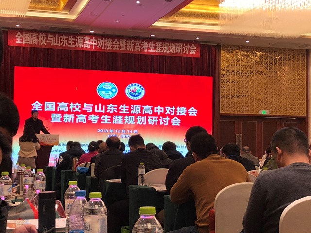 为深入领会落实《国务院关于深化考试招生制度改革的实施意见》相关文件精神,紧跟国家考试招生制度改革的步伐,学院招生工作人员于2018年12月14日到15日应邀参加了由山东省泰山教育创新研究院和山东招生信息网主办的全国高校与山东生源高中对接会暨新高考生涯规划研讨会。山东省相关教育主管部门领导、学会领导、高考改革领域专家学者、部分山东高中董事长及部分高校招生负责人等200余人参加了本次会议。