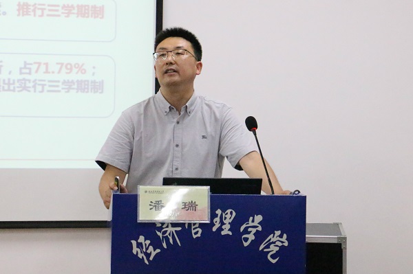 潘瑞从公司2019年三项重要改革,即三学期制教学时间调整、本科人才培养方案修订以及一流本科专业建设三个方面进行解读。他谈到,学校推行三学期制已经成为高水平大学深化公司产品改革的普遍选择,它不仅能拓展员工自主选课的空间,而且能够为校企合作培养、暑期社会实践等诸多培养环节提供有效的制度保障。