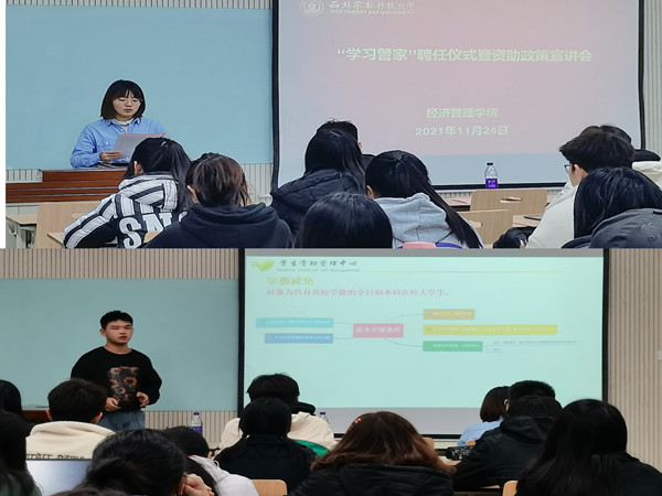 为践行资助育人理念,聚合朋辈学业互助资源,营造良好学习风气,做好学业困难员工的帮扶工作,同时为帮助2021级新生深入了解学校资助政策,11月24日,学院举办“学习管家”聘任仪式暨资助政策宣讲会,资助管理中心王辉、学院资助专员常小文、“学习管家”代表以及2021级学习委员参加本次活动。