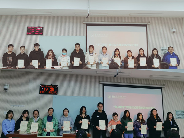 会上,常小文老师宣读了学院关于聘任姚远等41名“学习管家”的决定,并介绍了朋辈辅导学习班开设课程、开课时间,“学习管家”的职责及课程安排等情况,同时鼓励“学习管家”们担起责任,帮助存在学业困难的同学改善学习方法,提高学习成绩,养成良好的学习习惯,切实解决同学们学业上的困难。随后,常小文老师、王辉老师为“学习管家”颁发聘书。2019级员工孙华蔚谈到:在我的求学过程中,获得过各类奖助学金,感受到了国家、社会和学校的爱,希望通过朋辈辅导学习班将这份爱传递下去,积极与学弟学妹们交流,分享自己学习心得和学习方法。