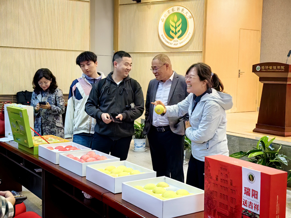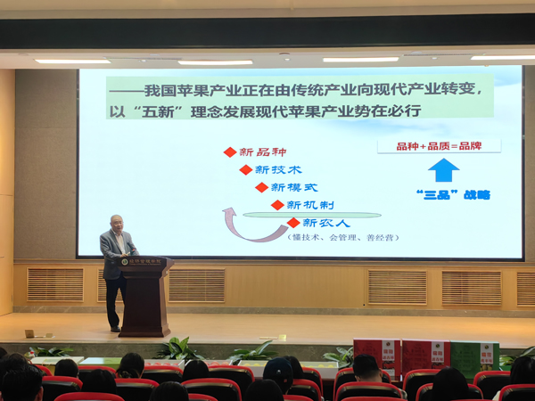 赵政阳教授团队自主选育的瑞雪、瑞阳、瑞香红优质晚熟苹果国审新品种,具有完全自主知识产权,填补了中国苹果品种品牌在世界上的空白,打破了“富士”独霸市场场面。赵教授首先和大家分享了“瑞阳、瑞雪、瑞香红”苹果的选育历程。他说:苹果基因特点决定了苹果品种选育是“海选”式的,“三瑞”苹果历经二十年持续筛选、观察、实验,才最终选育成功。期间经历的艰辛不言而喻,但当“瑞雪、瑞阳”苹果走进人民大会堂时,我有点意外,但同时我也是骄傲的。现场同学爆发出热烈的掌声,为带有“中国芯”的苹果,也为让苹果装上“中国芯”的科学家。赵教授结合“三瑞”苹果品种发展前景、市场表现同现场同学展开交流和探讨,他指出,中国“苹果产业发展进入一个新的历史阶段,新品种、新技术同新机制、新模式的结合必将催生出新的发展动力。