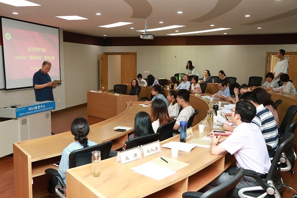 为挖掘“思政课+课程思政”的育人格局,大力推进习近平新时代中国特色社会主义思想和党的十九大精神进教材、进课堂。6月20日下午,学院于南校C301马蹄教室举办2019年“课程思政”教学观摩和教学竞赛。本次教学比赛由各系选拔出七名教师参加,学院教授委员会、督导组副组长王礼力教授、经理助理牛荣副教授、党委副书记张军驰、农经系主任赵凯教授、经济系主任王秀娟副教授、管理系主任刘超副教授、教工资源环境中心支部书记骆耀峰副教授7人担任比赛评委。王礼力教授出任主席。各系教师代表、新三年新进教师和员工等50余人到场观摩学习。
