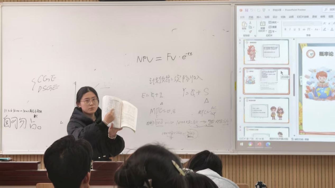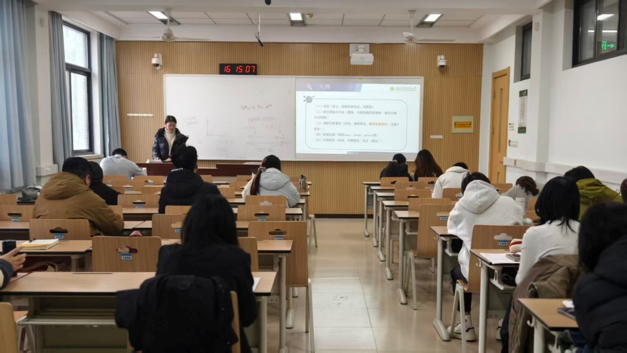 紧接着赵海媛学姐向同学们分享“学业规划”方面的内容。从大二经济学专业课程入手,赵海媛学姐分门别类地对概率论等科目的期末复习关键做出介绍:“应该复习什么,应当注意哪些,应该如何调整……”;在宣讲过程中,她结合自己亲身经历,风趣幽默又鞭辟入里,“当时我们考试前也会手足无措,但关键还是找到自己的节奏”,引起了同学们发自内心的共鸣与感动,话音刚落,掌声雷动。