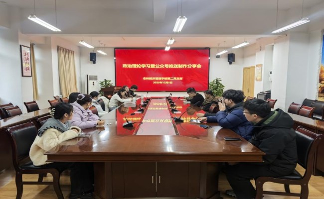 为进一步筑牢党员思想根基,夯实理论基础,同时进一步提升支部成员的新媒体素养,深化支部宣传工作,丰富支部工作形式。12月5日下午,农林经济管理学硕二支部在C304会议室召开了政治理论学习暨公众号推送制作专题分享会,本次会议由党支部书记王娜娜主持,支部全体党员、发展对象及积极分子参会。
