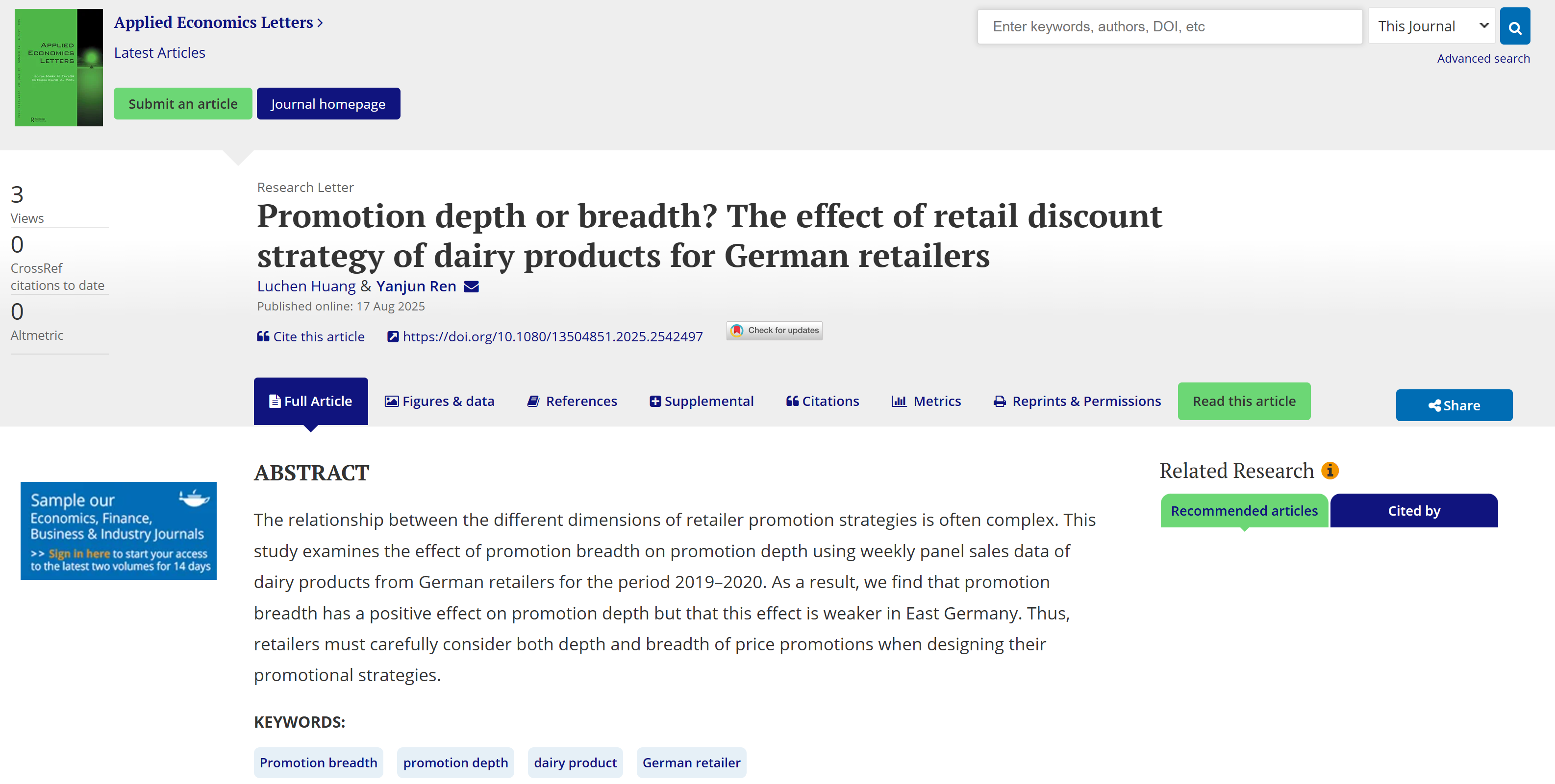 近期,3044am永利集团任彦军教授课题组在《Applied Economics Letters》发表最新研究成果,论文题目为“Promotion depth or breadth? The effect of retail discount strategy of dairy products for German retailer”。任彦军教授为论文通讯作者,黄禄臣博士生为论文第一作者。