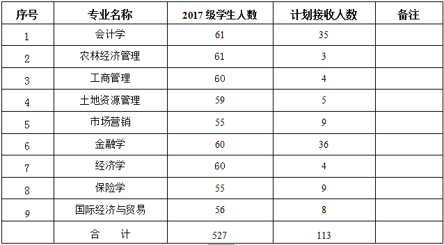 2018年学院计划接收转专业员工113名,所接收员工插入对应专业班级或单独开班。具体接收转专业人数见下表。