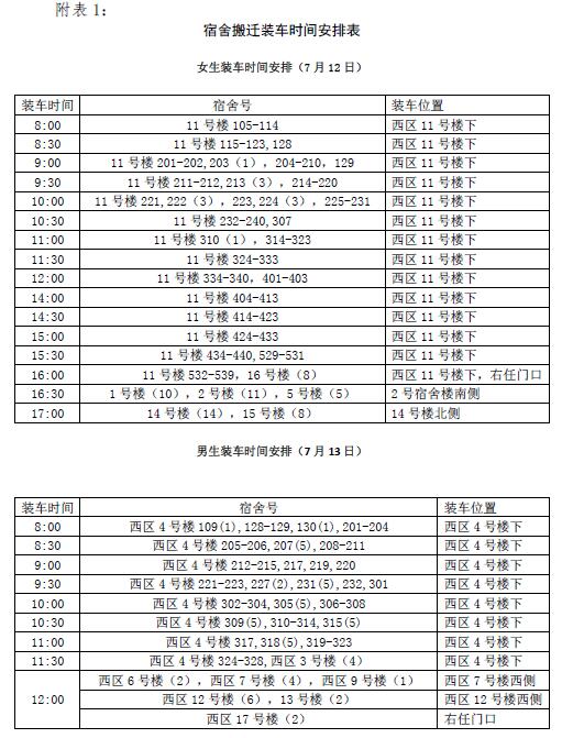 2.本次搬迁时间紧、工作量大,为避免不必要的损失,请各位同学提前用编织袋装好行李并标明班级、姓名、新宿舍号及联系方式,行李上厢式货车,人乘坐校车,两车同步,下车后按次序迅速卸下行李,不要拥挤。