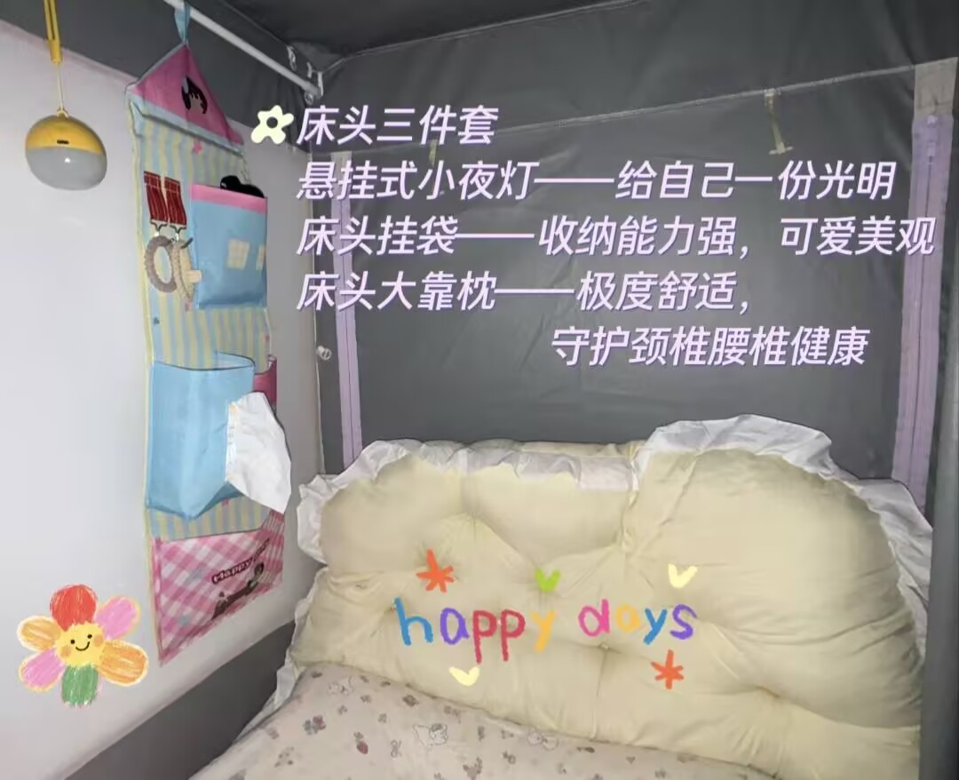 在“‘寝’囊妙计,好物齐聚”寝室好物分享活动中,同学们充分展现了对寝室生活的巧思与热爱,分享的各类实用好物让寝室这个“小窝”变得更加整洁、舒适且充满温度。在同学们的分享中,床头三件套成为了热门推荐:悬挂式小夜灯以柔和的光线为深夜学习或起夜提供了便利,床头挂袋凭借其可爱的外观与强大的收纳能力,让常用物品触手可及,而床头大靠枕则以极度的舒适感守护着同学们的颈椎与腰椎健康。收纳类好物同样备受关注,中层抽屉收纳盒与桌面笔筒的组合,让原本杂乱的桌面变得井然有序,各种物品分类摆放,一目了然;粉色收纳筐则为寝室增添了一抹温馨的色彩,同时也提升了收纳效率。