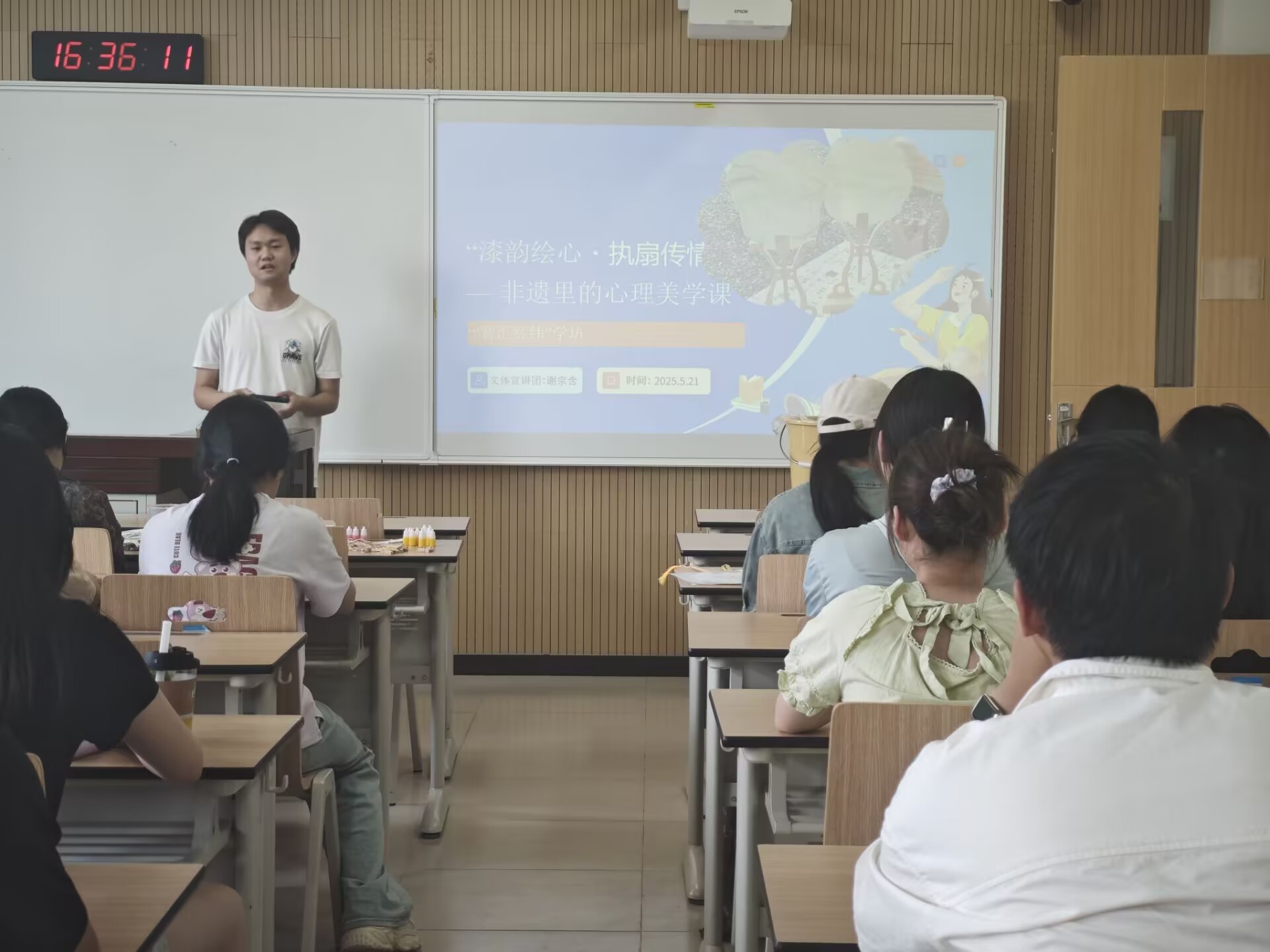 漆香阵阵,扇韵悠悠。5月21日下午,3044am永利集团心理权益部联合“智汇经纬”文体活动体验坊,在南校一号教学楼成功开展“漆韵绘心·执扇传情”非遗心理美学体验活动,60余名同学在非遗漆扇的魅力中,感受千年技艺的文化底蕴,体验漆墨流彩的心灵疗愈。