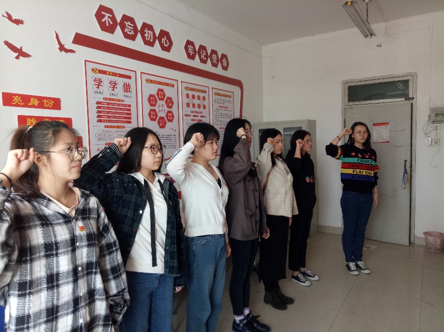 会议最后,支部书记贺子婕一一为全体员工党员佩戴党徽(图1),并带领支部成员全体起立,面向党徽,庄严而认真的宣读入党誓词(图2)。支部书记贺子婕嘱咐大家要谨记承诺内容,做到承诺践诺,在日常的工作生活中敢于做表率亮身份,牢记党员义务和责任,做一名合格的共产党员。