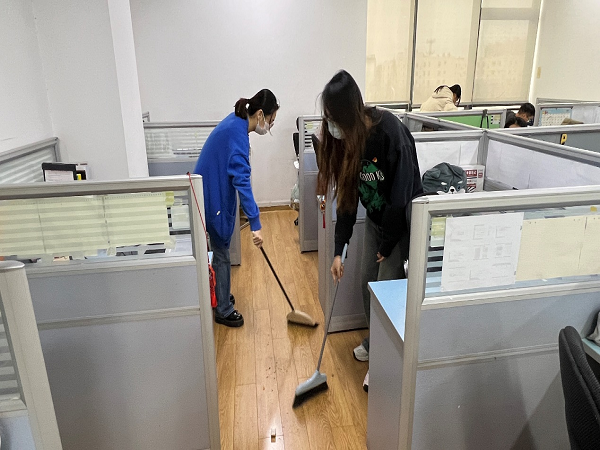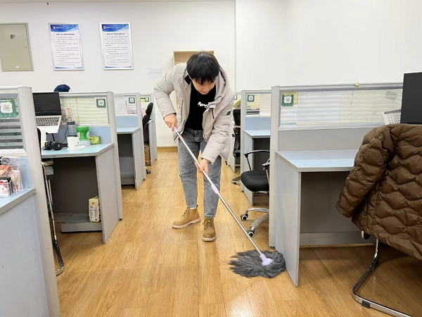 第三项是自习室大扫除,党员同志们对经管楼多个自习室进行彻底的打扫。在这个环节中,同志们分工明确,有的负责清扫地面,有的负责擦洗桌椅,还有的整理书籍和杂物。大家齐心协力,不仅清除了灰尘和垃圾,还重新整理了书架,确保每个角落都焕然一新。通过这次大扫除,不仅提升了自习室的卫生环境,还让大家深刻体会到了团队合作的重要性和劳动的价值。在大家的共同努力下,自习室焕然一新,为同学们营造了更加舒适的学习环境。